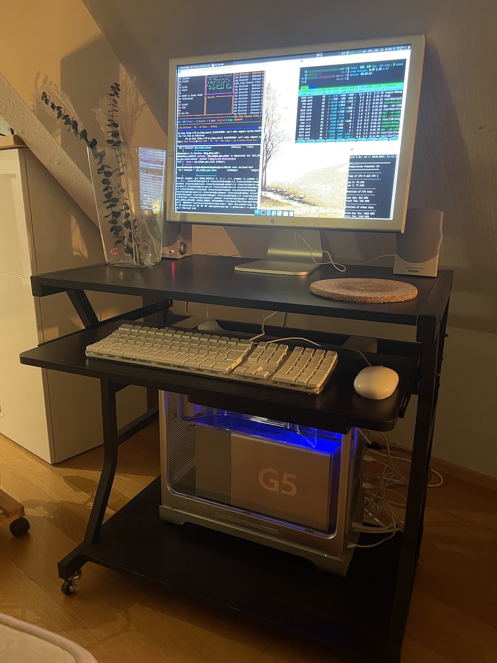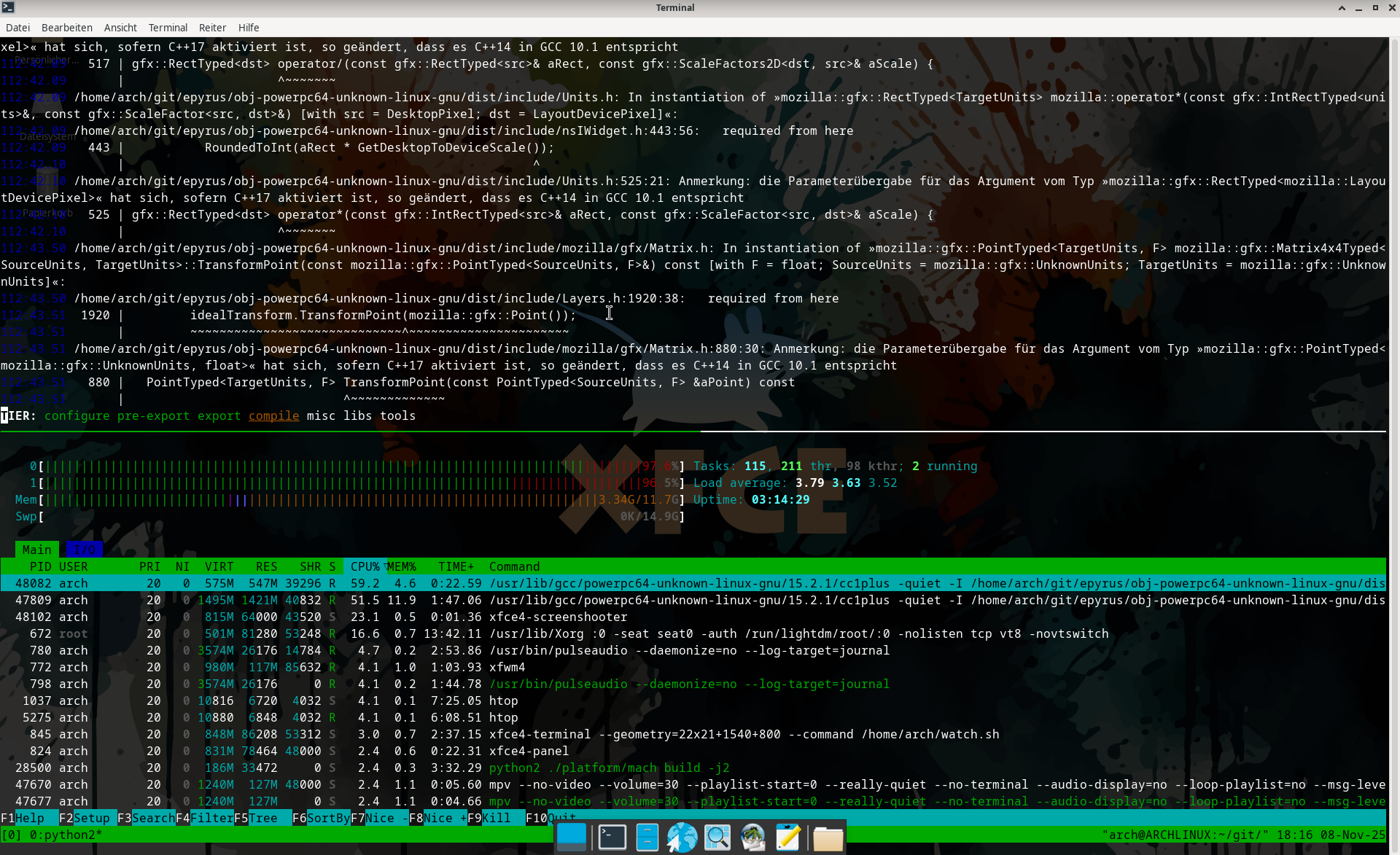 My bigfat Powermac G5 Workstation running ArchPOWER 64 while compiling Claws-Mail under XCFE and running TerminalDrome