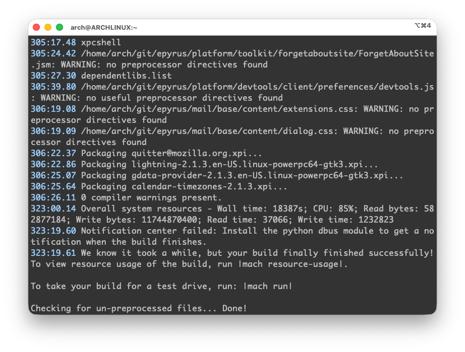 I thought I will give it a try and see if it compiles under good old Powermac G5 ARCH Power Linux and now, as I write this article, it compiles since 273 Min. straight. So I am very courius if it will work or if it break up at the end.